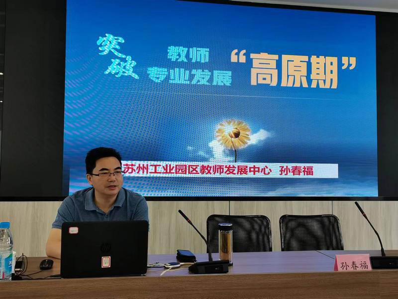 学校请来了苏州工业园区教师发展中心的特级教师孙春福老师做了题为《突破教师专业发展“高原期”》的讲座。孙老师指出:处在“职业高原期”的教师想要突破,既需要提供支持性改善平台与机会,也需要教师自主走向内在驱动的自我革新,同时提升教学水平和改善教学策略。讲座中,孙春福老师利用教师专业成长的“五阶段”、“三阶段”理论,“2441”微笑操作法等事例,幽默地激励老师们要不断提高自我内在素养,避免或克服以职业倦怠为特征的“职业高原期”,努力朝卓越教师的目标迈进。
