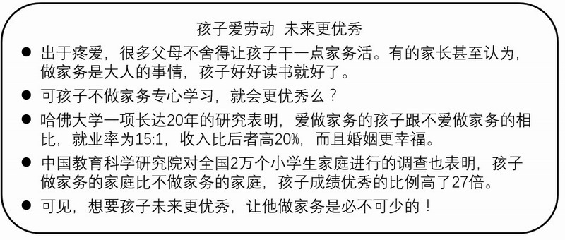 孩子优秀的成就从来都不是只局限在课内学习,家庭生活中的锻炼能带给孩子更多发展。看似简单的家务劳动,带给孩子的独立、自信、自强都是一生的财富。爸爸妈妈们应该学会让孩子去体验家务劳动,孩子进一步,大人退一步,这就叫成长。
