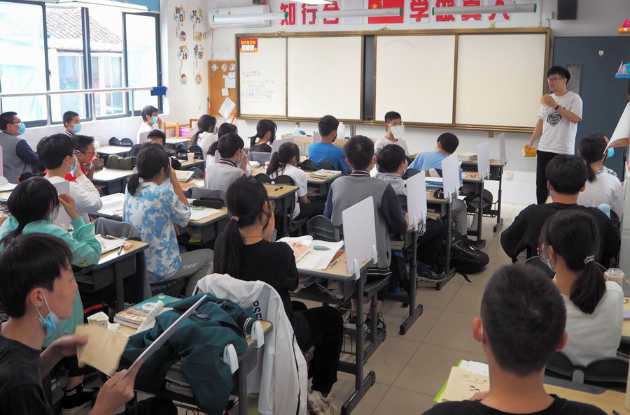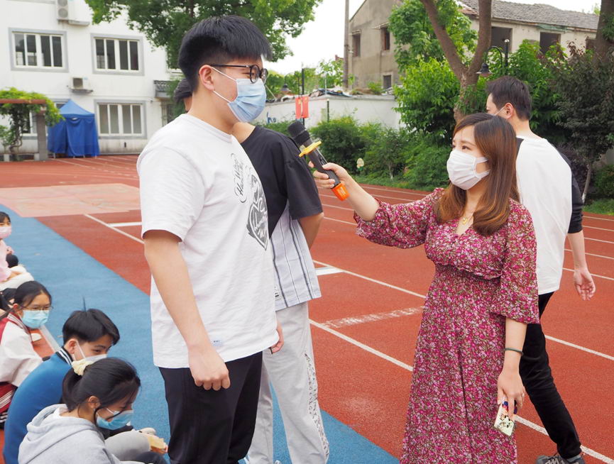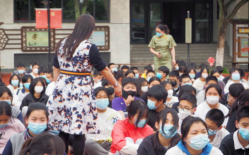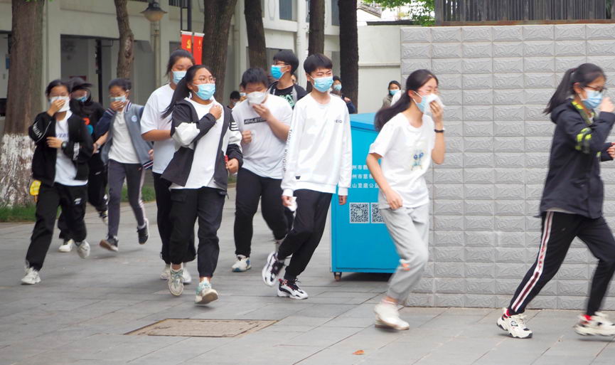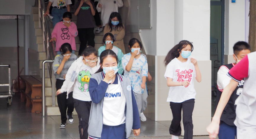 下午4点,随着吴蔚兰老师的一声令下,“火灾警报”信号响起,初二学生们在各班班主任的指挥下,用湿毛巾捂住口鼻、弯腰,按指定路线快速紧张有序地撤离到操场空旷地带,班主任清点人数并确认受伤情况,汇报给吴老师。整个演练过程快速、有序。