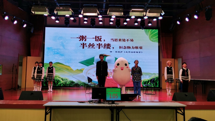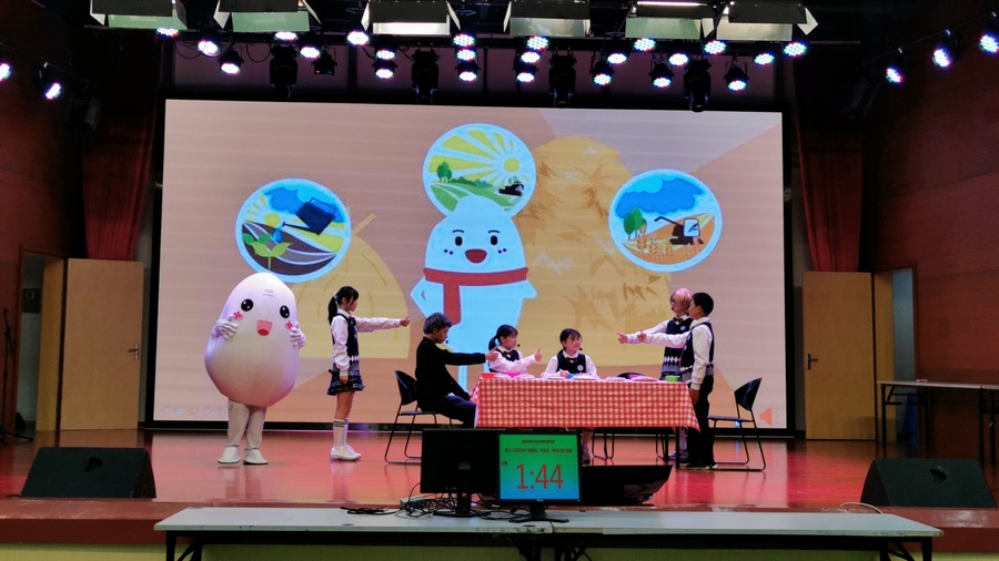 本次“三话”我校参赛剧本命名为“一粒米的故事”,以米小白的卡通形象串起整场剧,通过“家家”、“园园”浪费粮食的故事,引出国家号召“厉行节约”“光盘行动”的主题。