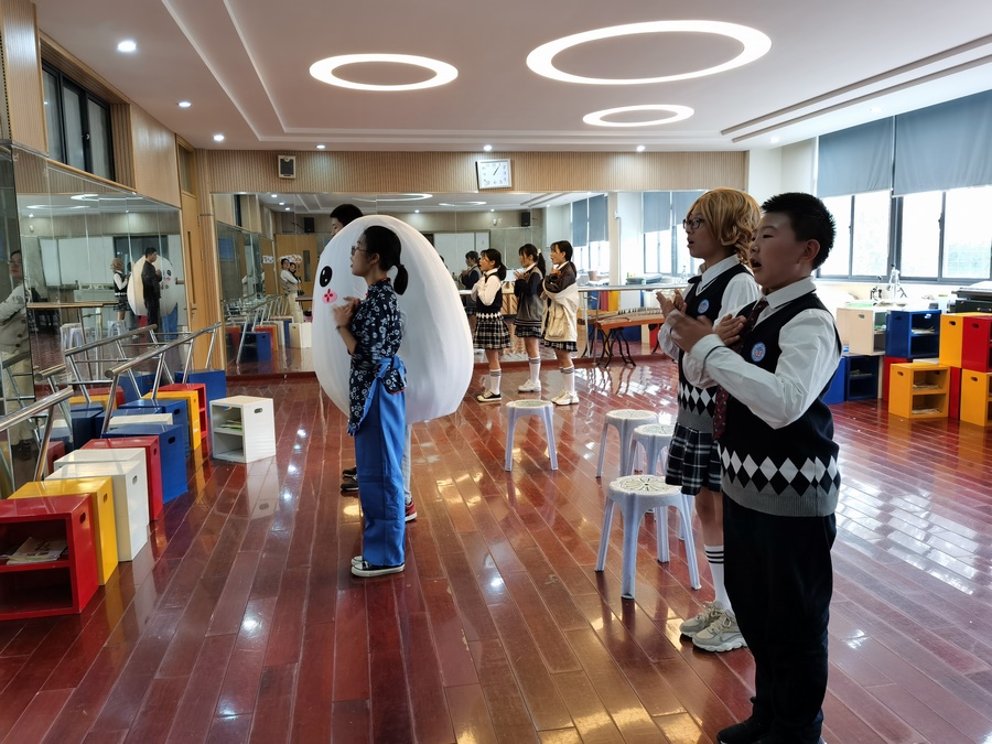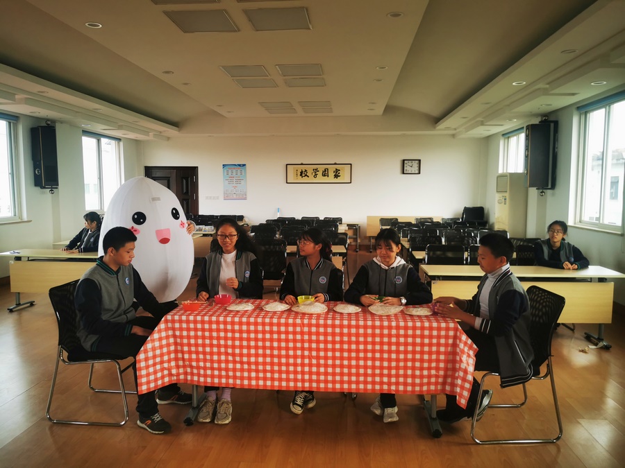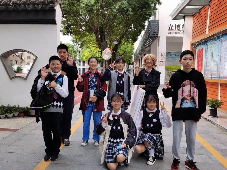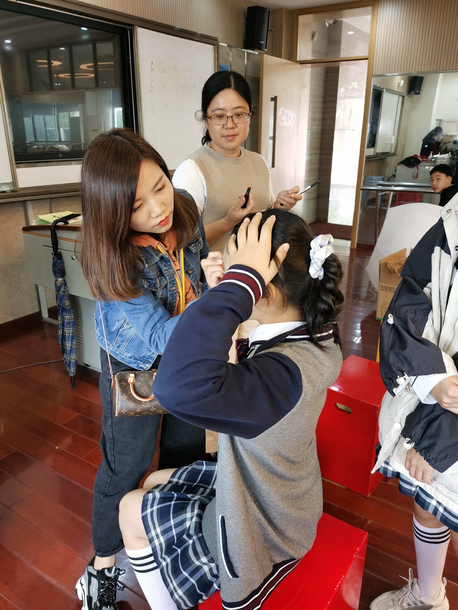 比赛的准备过程细致而漫长,我们从初一初二全体学生中海选到复选,精挑细选出了初一金晔晨、葛诗妤、唐雨馨、戴馨瑶,初二张琰、赵嘉裕、吕思锦、吴梦媛这八名同学。由语文教研组长吴蔚兰老师原创剧本,在张涵韵、吴蔚兰、周婷、陈筱庆老师的精心指导下,从最初的研读剧本、熟悉语言到反复排练、打磨细节,整整排练了一个半月的时间。