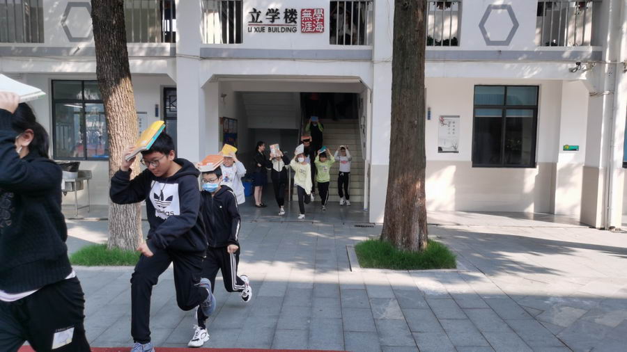 第二次警报响起时,同学们在老师监护下快速以书或书包护头,有序撤离。站队,清点人数,汇报情况,整个演习有条不紊,井然有序。同学们非常认真地进行情景模拟,每个步骤都演练到位,演练计划精细到每个人,每一秒,尽最大的努力做到安静、快速、有序、安全撤离。