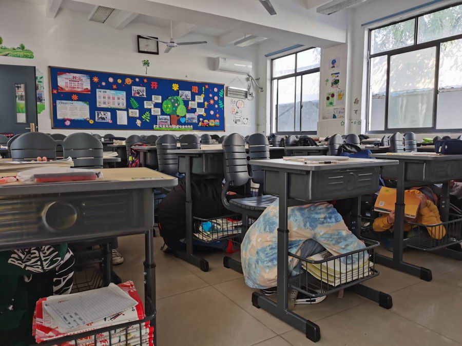 在警报响起时,教师迅速到位,指挥学生躲入桌底,护住头部。