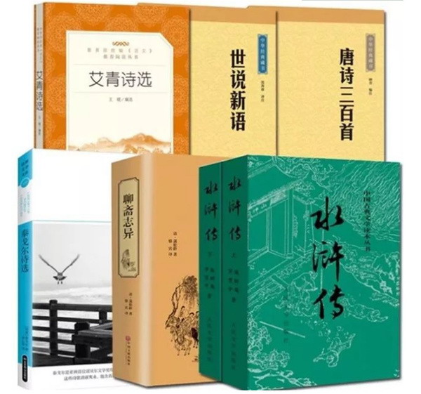 九年级上册: 1.《艾青诗选》 2.《水浒传》 3.《泰戈尔诗选》