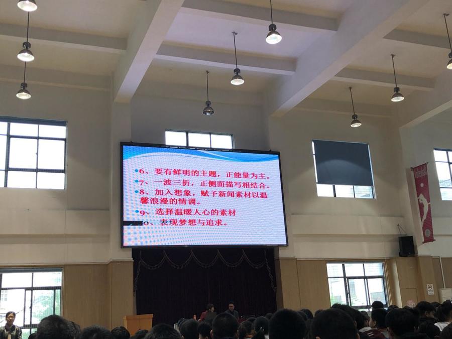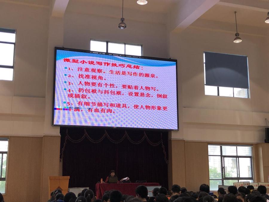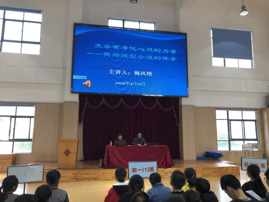 2019年4月12日下午,我校初一初二全体学生聚集在大礼堂,聆听本校教师,微型小说作家梅凤艳老师关于微型小说写作的讲座。会议由田明亮书记主持。