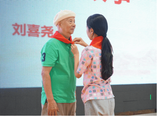 刘喜尧爷爷已八十多岁高龄,他是昆曲“继”字辈传人,是著名相声表演艺术家马季先生的唯一江南弟子,他是热衷于关心关爱青少年健康成长的“五老之一”。初一年级的孩子们热情欢迎刘喜尧老师的到来,并为刘老师献上了鲜艳的红领巾。