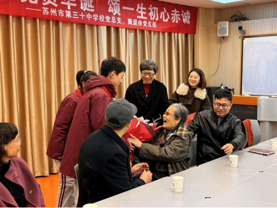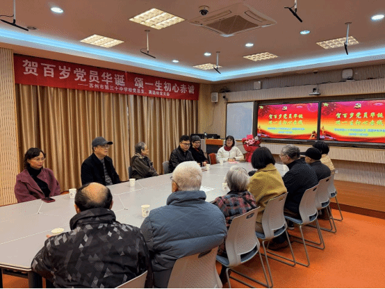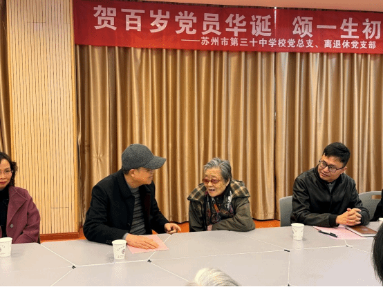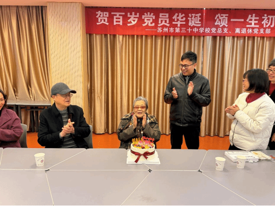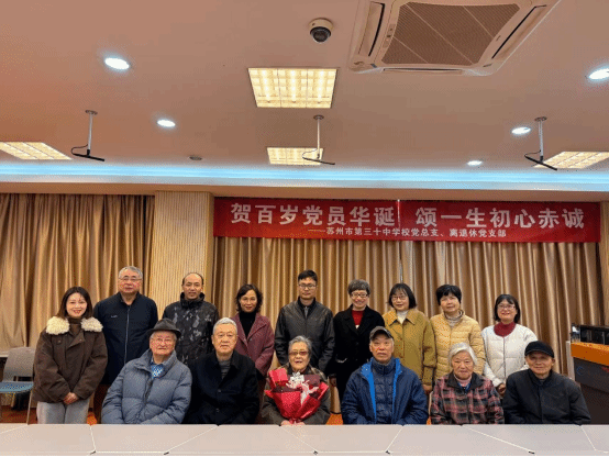 2025年11月20日上午,苏州市第三十中学校未来教室内暖意融融、情意深切,学校党总支、离退休党支部为百岁离休干部张冰同志举办了隆重俭朴的祝寿活动。校领导、退休党员、在职党员教师代表及少先队员代表齐聚一堂,共同致敬这位用一生践行初心与使命的老党员、老书记。