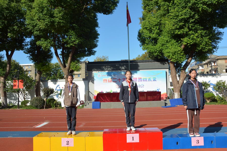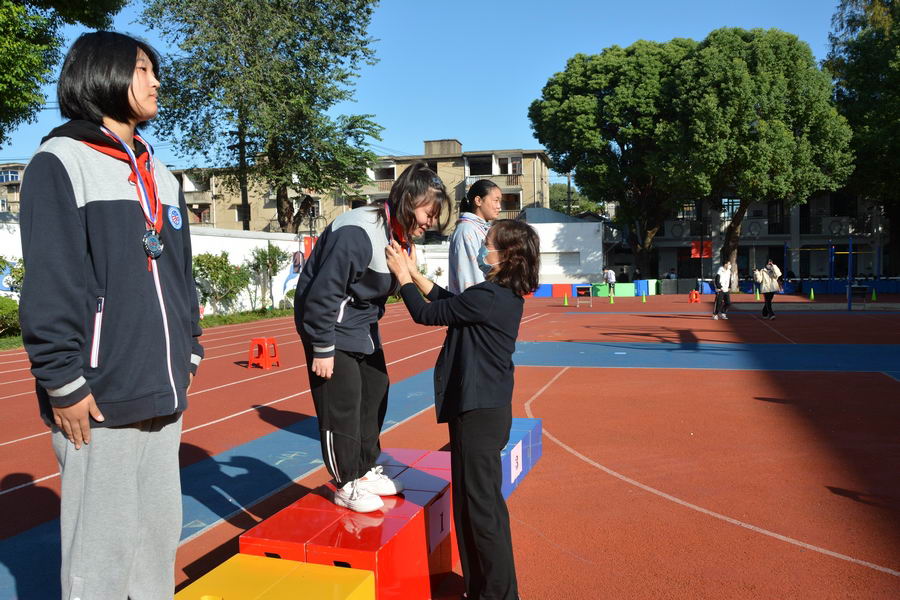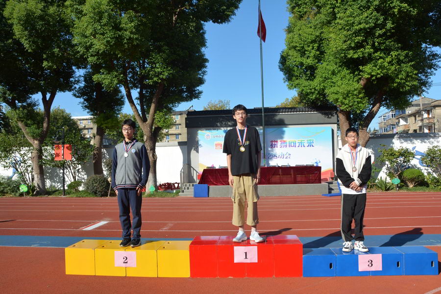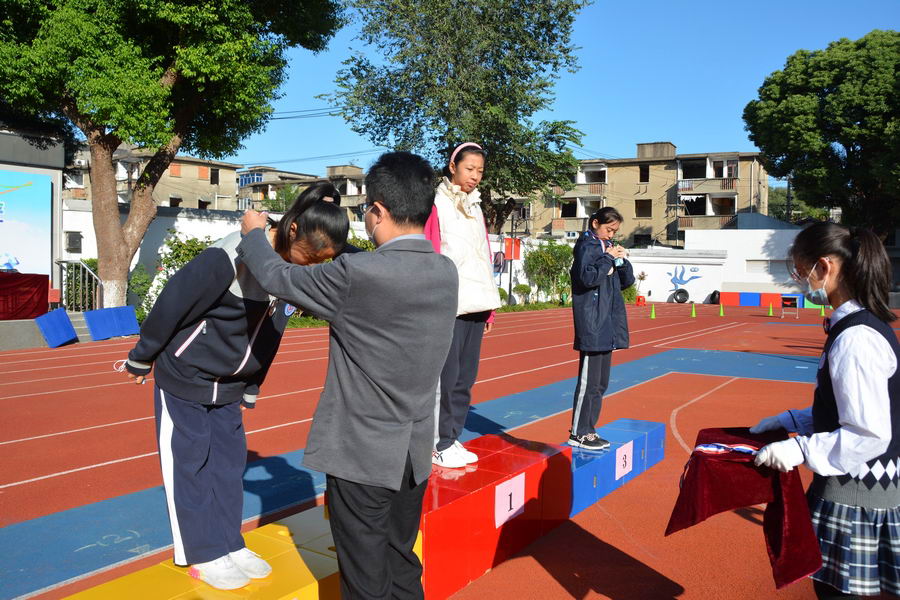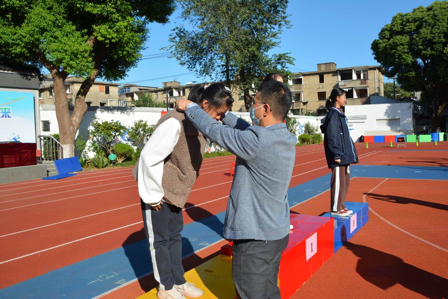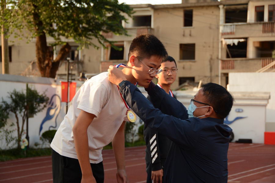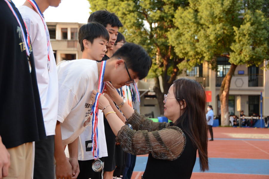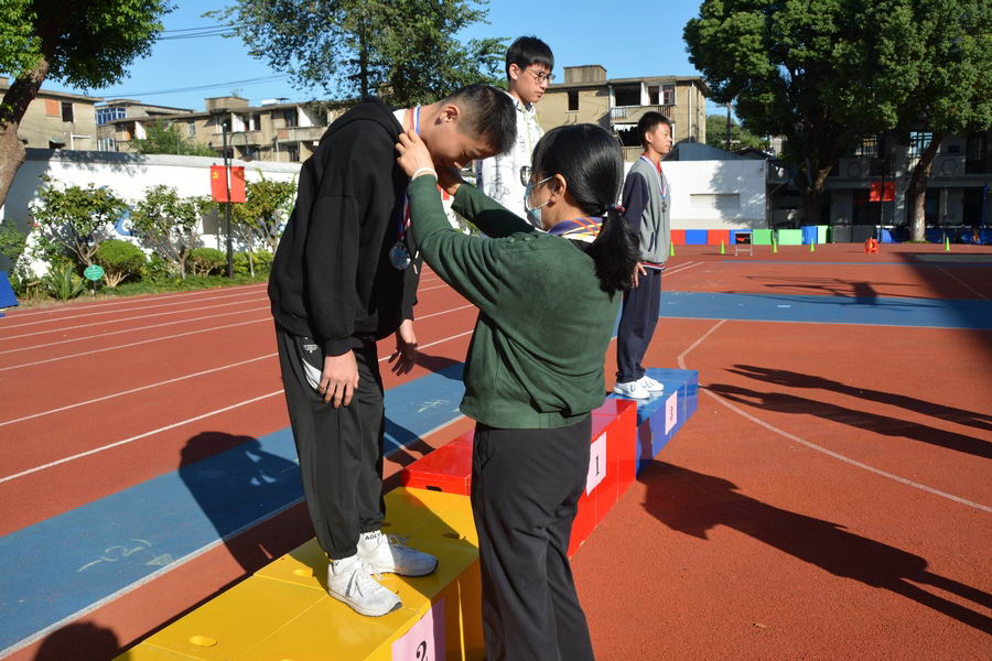 努力终有收获,荣誉将被铭记!学校领导亲自为冠亚季军戴上荣誉的奖牌,颁奖台上的同学们意气风发,享受着此刻的欢呼和掌声!