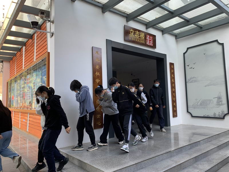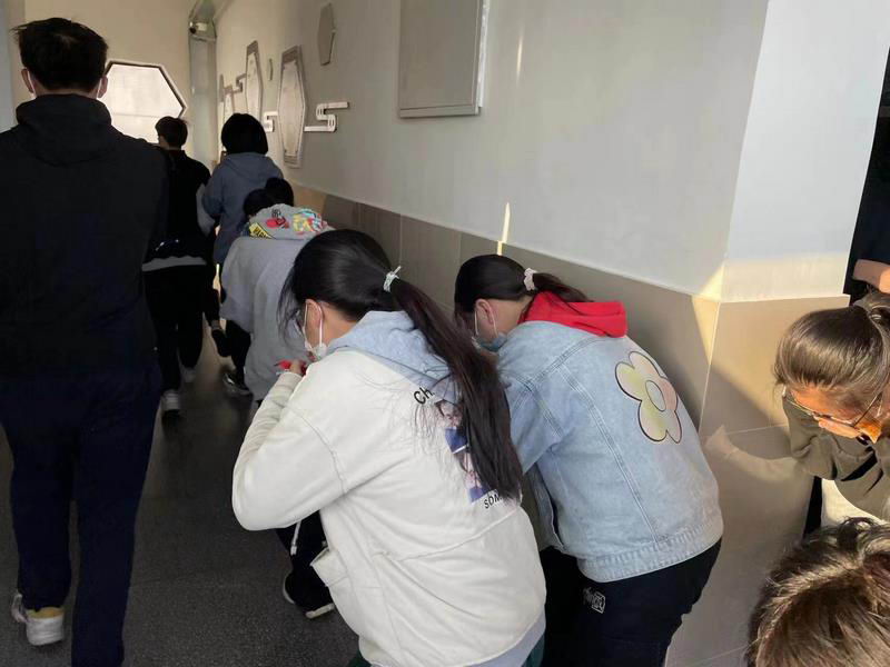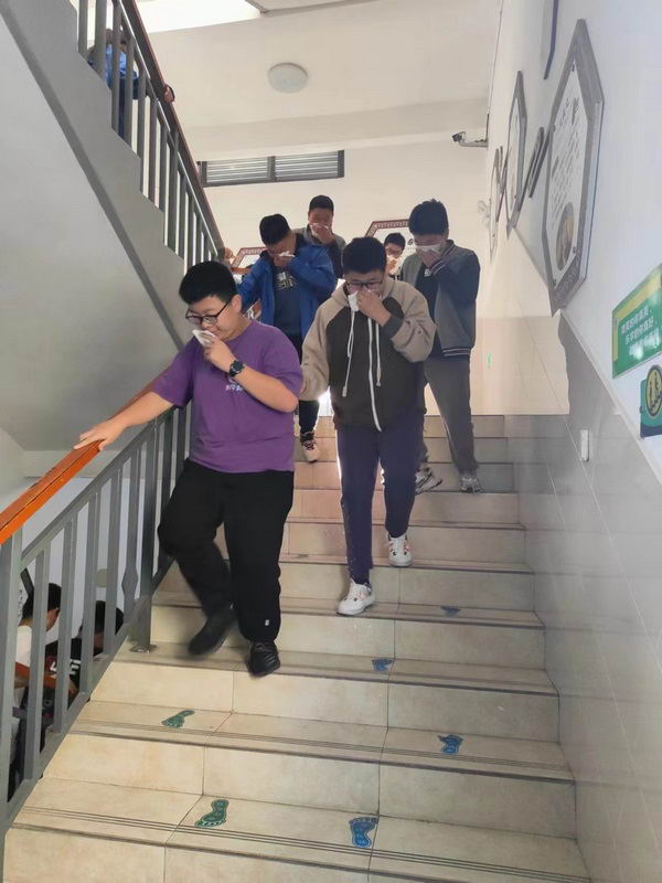 下午4点,"火灾警报"信号响起,各工作人员迅速到达指定位置,学生们在各班班主任的指挥下,用湿毛巾捂住口鼻、弯腰,按指定路线快速有序地撤离到操场空旷地带,班主任清点人数并确认受伤情况,汇报给吴蔚兰主任。