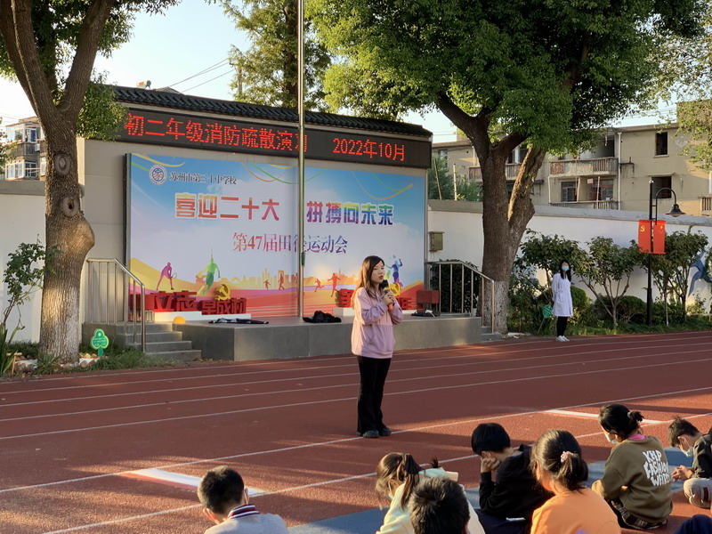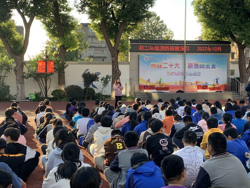 为进一步加强校园消防安全,切实提高广大师生的消防安全意识,提高师生防灾能力及突发事件应急处理能力,我校于2022年10月19日下午对初二年级师生开展了消防应急疏散演练。
