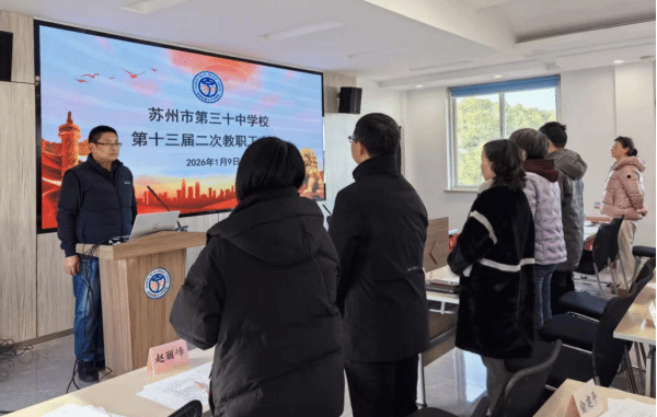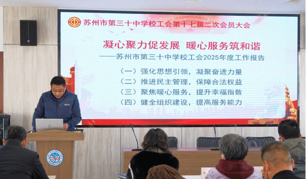 2026年1月9日下午,苏州市第三十中学校第十三届二次教职工大会暨工会第十七届二次会员大会在立德楼报告厅隆重召开。会议由校工会主席王游主持,全体教职工参加了本次大会。