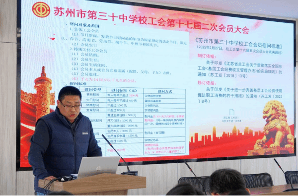 大会还听取了我校工会2025年度财务收支情况报告,审议并表决通过了修订后的《苏州市第三十中学校工会会员慰问标准》。新标准依据最新文件精神,提高了会员节日福利额度标准,优化了生病住院慰问形式,并新增了对子女为14周岁以下会员的慰问项目,进一步体现了组织关怀。