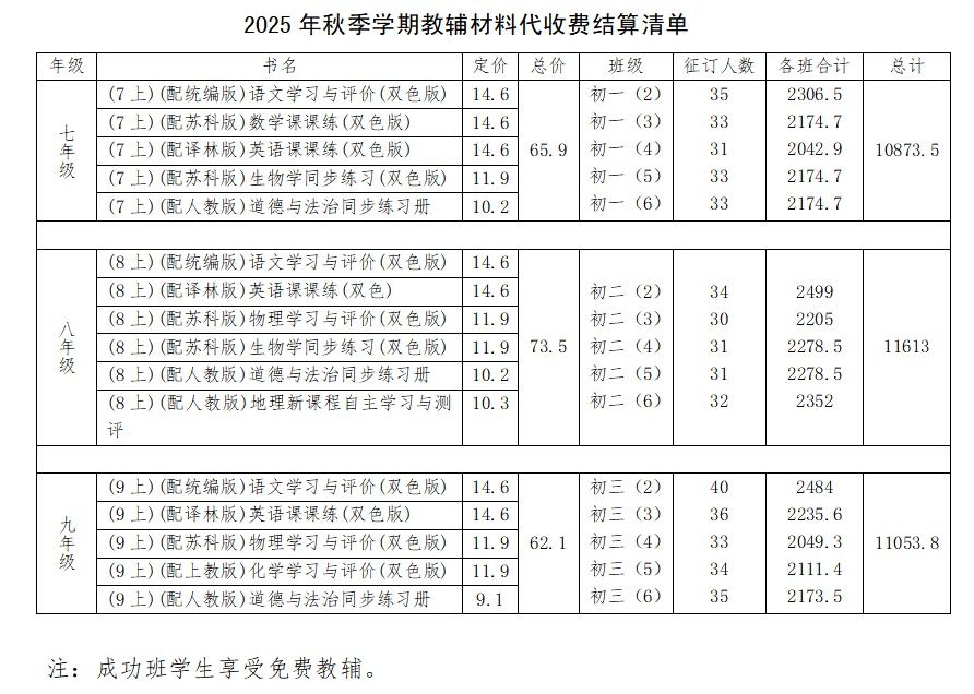 学校根据《省教育厅办公室关于进一步做好中小学教辅专项整治工作的通知》(苏教办材函〔2025〕3号)、省教育厅《中小学教辅整治工作提示函》、市教育局《全市中小学教辅推荐选用征订工作指引(试行)》文件精神,结合苏州市发改委、市教育局《关于实行中小学校服务性收费和代收费项目清单管理的通知》(苏发改费〔2025〕11号)有关要求,现将2025秋季列入省定中小学评议教辅推荐目录的教辅材料(一科一辅)学校代收费结算进行公示。